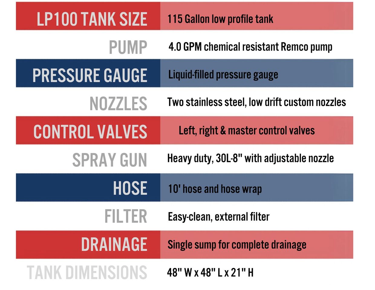 Each LP100-BB sprayer features a 4 GPM Remco™ chemical resistant, diaphragm pump. These on-demand pumps are self-priming and have a built-in check valve preventing back flow through the pump.