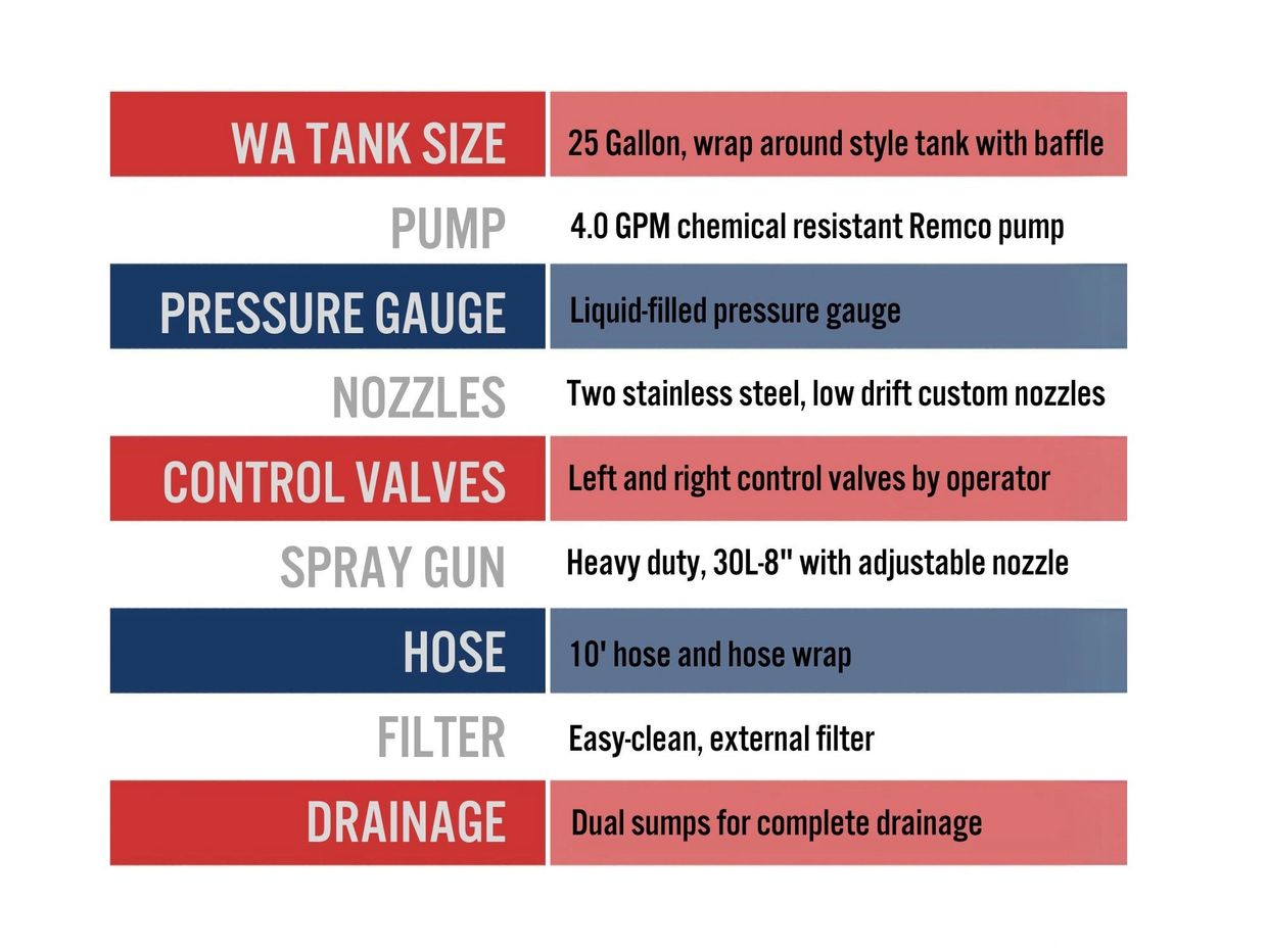 25 gallon wrap-around tank, dual Superior 1400SI nozzles, 4 GPM pump, GunJet ® 30L-8 spray gun with adjustable tip.