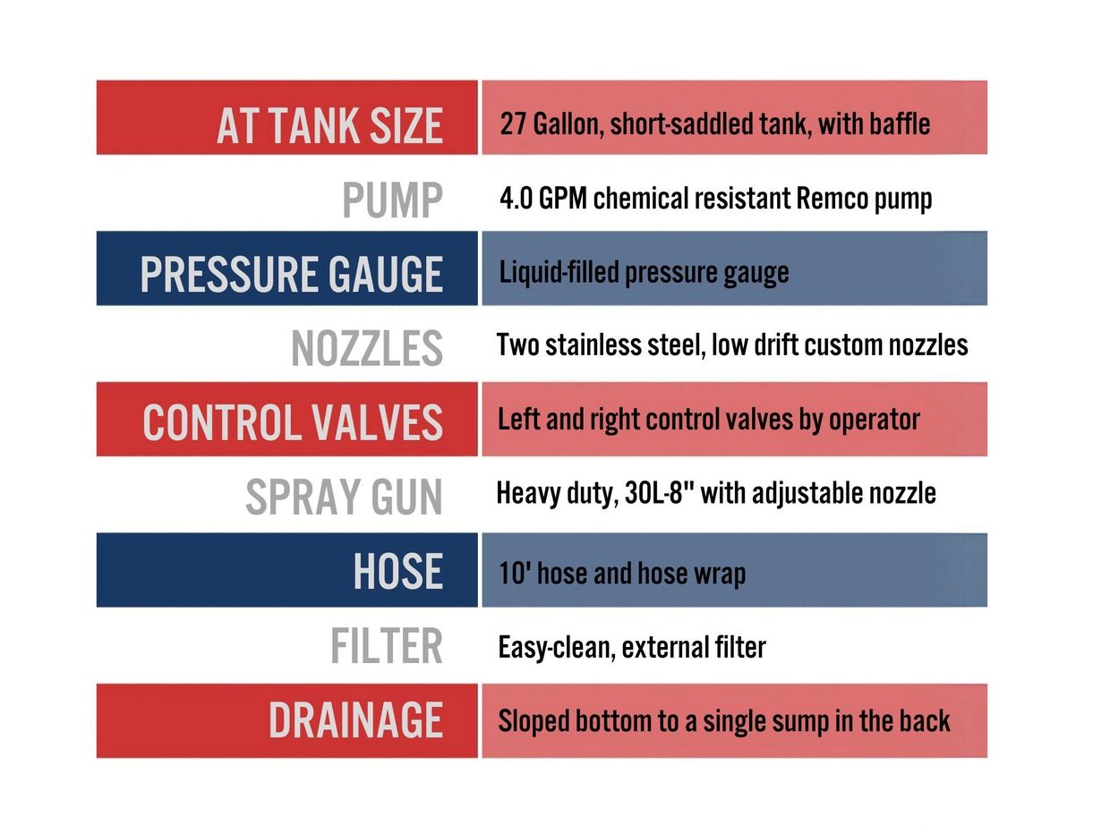 27 gallon tank with short saddles, dual Superior 1400SI nozzles, 4 GPM pump, GunJet ® 30L-8 spray gun with adjustable tip.